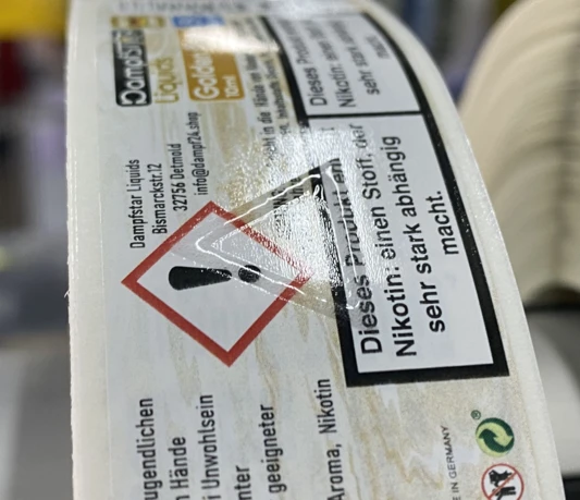 Vi producerer også etiketter med selektiv relieflak, f.eks. etiketter med en advarselstrekant, der er påført etiketten ved hjælp af serigrafi.