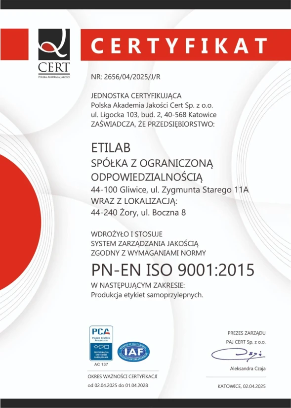 Priorytetowym celem firmy Etilab Sp. z o.o. z siedzibą w Gliwicach jest stałe spełnianie wymagań Klientów poprzez osiągnięcie i utrzymanie wysokiego poziomu jakości produkcji etykiet samoprzylepnych.